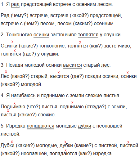 1. Я рад предстоящей встрече с осенним лесом. 2. Тонконогие осинки застенчиво толпятся у опушки. 3. Позади молодой осинки высится старый лес. 4. Я нагибаюсь и поднимаю с земли свежие листья. 5. Изредка попадаются молодые дубки с неопавшей листвой.