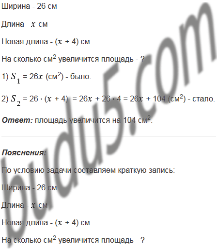 Ширина прямоугольника равна 26 см. На сколько квадратных сантиметров увеличится площадь этого прямоугольника, если его длину увеличить на 4 см?