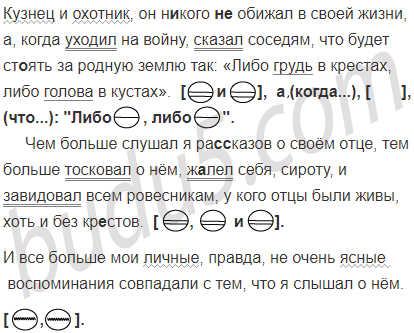 Сердобольные деревенские старушки часто тешили меня ра(с, сс)казами о погибш..м батьке. В этих старушечьих воспоминаниях отец мой выгл..дел всегда только хорошим и (не)просто хорошим а (не)обыкновенным. Он был силён и смел весел и добр справедлив и пр..ветлив со всеми. Все односельчане очень любили его и жалели о нём. Кузнец и охотник, он н..кого (не)обижал в своей жизни, а когда уходил на войну, сказал соседям, что будет ст..ять за родную землю так: «Либо грудь в крестах, либо голова в кустах».