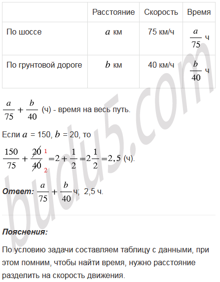 Автомобиль проехал по шоссе км со скоростью 75 км/ч и по грунтовой дороге км со скоростью 40 км/ч. За какое время автомобиль проехал весь путь? Составьте выражение и найдите его значение при = 150, = 20.