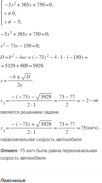 Первые 150 км дороги из города А в город В автомобиль проехал с некоторой скоростью, а остальные 240 км - со скоростью на 5 км/ч большей. Найдите первоначальную скорость автомобиля, если на весь путь из города А в город В он потратил 5 ч.